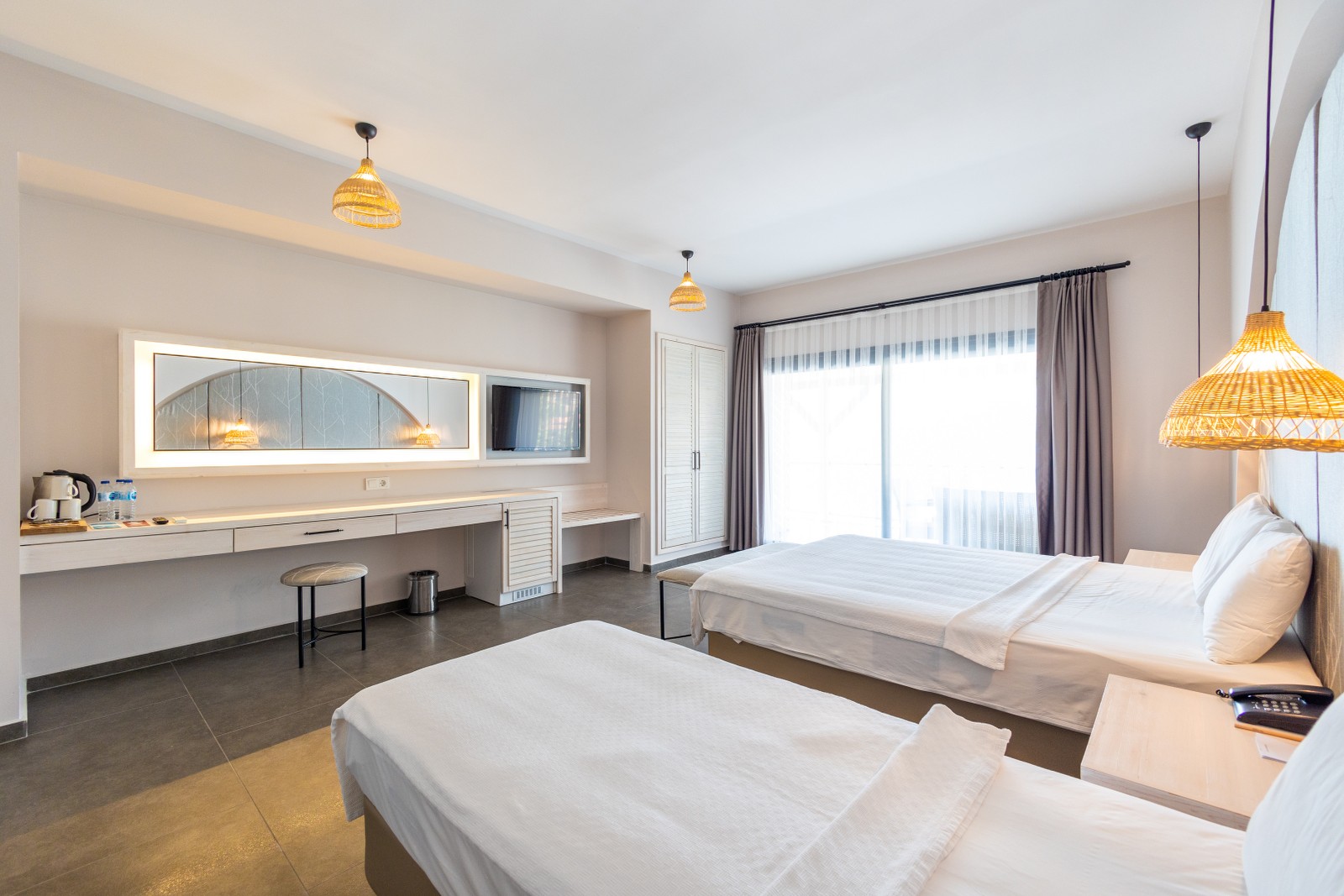 Büyüklük: 35m² Yatak: 160x200 ve 80x200 Teras: 14m² TV: 39" LED TV Klima: Split Klima Güvenlik: Şifreli Mini Kasa Minibar Saç Kurutma Makinası