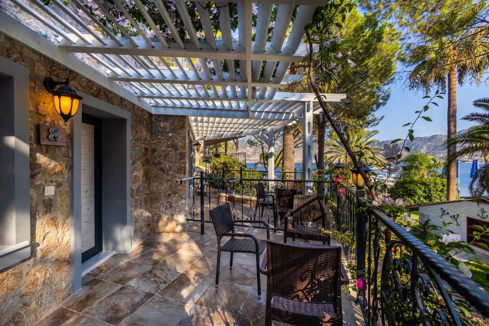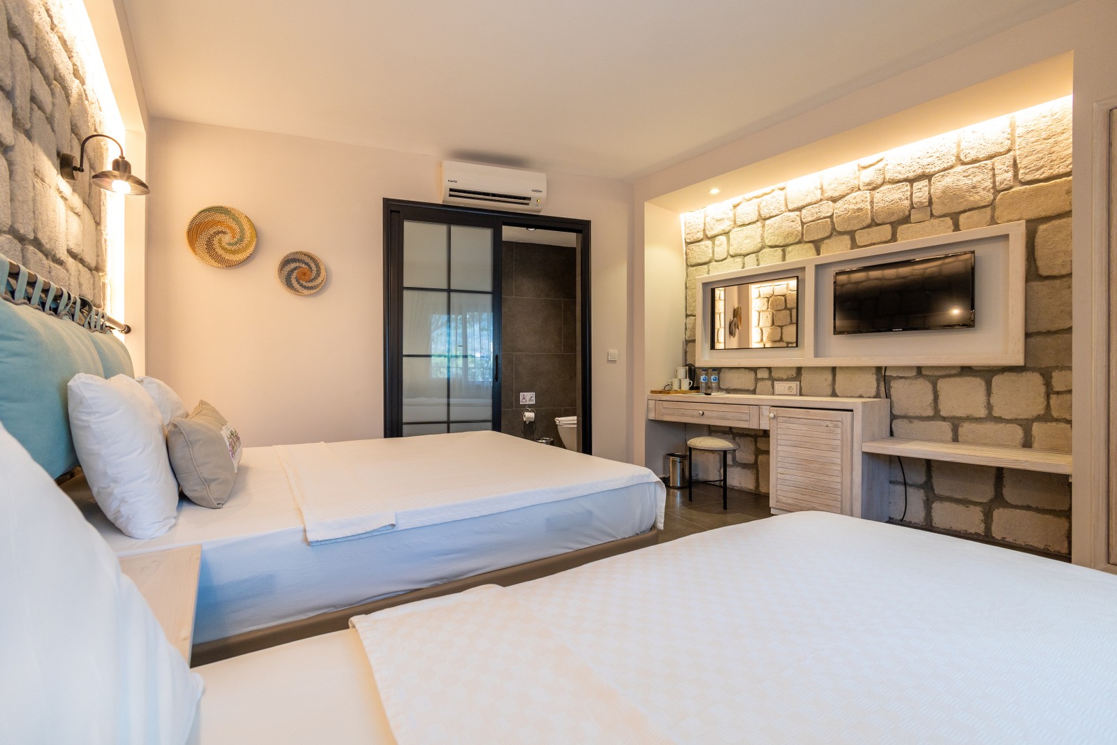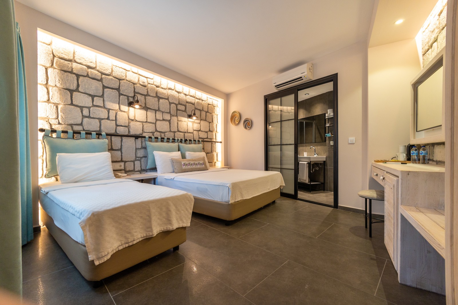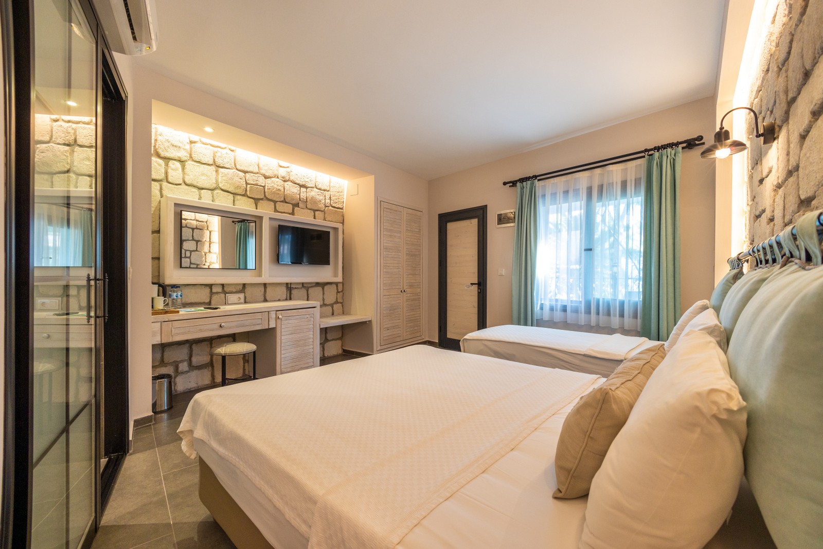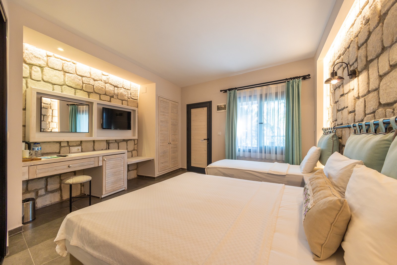Büyüklük: 20m² - 32m² Yatak: 160x200 (2 adet odada) Yatak: 160x200 ve 80x200 (8 adet odada) Teras: 11m² - 24m² TV: 32" - 39" LED TV Klima: Split Klima Güvenlik: Şifreli Mini Kasa Minibar Saç Kurutma Makinası